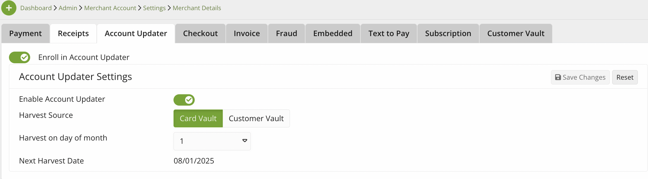 Configure basic Account Updater settings by selecting the harvest source and the day of each month's harvest:
