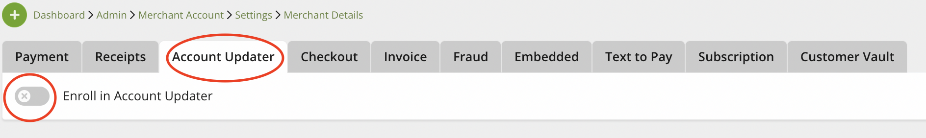 Select the toggle next to 'Enroll in Account Updater.' This generates a pop-up.