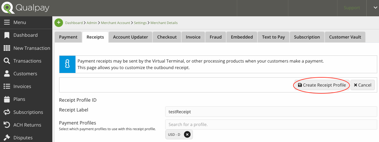 This page provides instructions for using the Qualpay Manager portal to customize the receipts you send to customers. By default, Qualpay uses a receipt profile with minimal information prefilled so that you can start transacting and sending receipts immediately. By accessing your receipt profile in the Qualpay Manager portal, you can customize your receipts for Hosted Checkout, Virtual Terminal, Payment Gateway, Invoicing, or Recurring Billing.