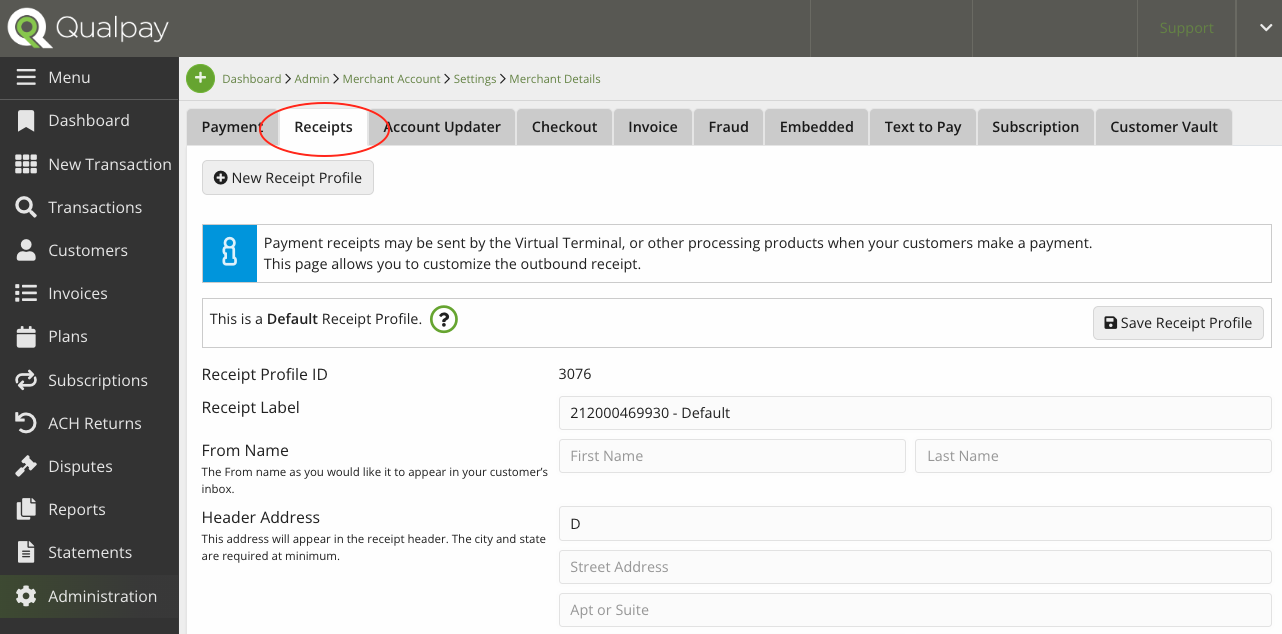 You are now on the receipt configurations page for the default receipt profile in use by all of your Qualpay products.