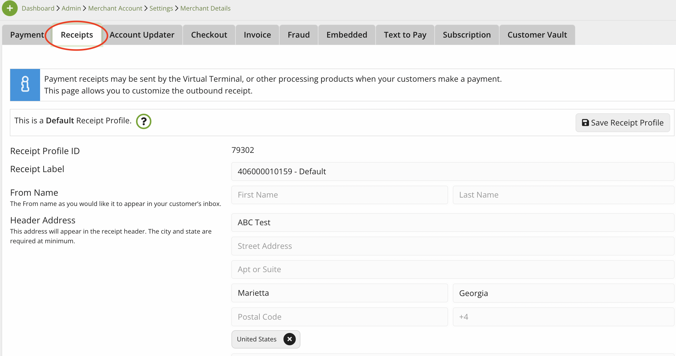 - Receipt Profile ID - View the ID number of the receipt profile. The Checkout API requires this if your account has multiple active receipt profiles.
