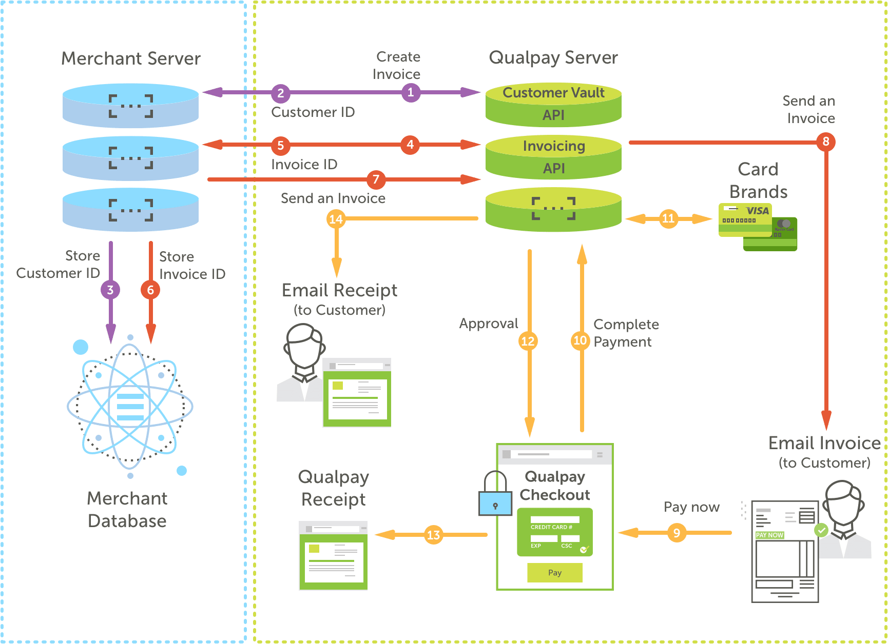 - The merchant server uses the Invoice API and customer ID to send a 'Create an Invoice' request to Qualpay.