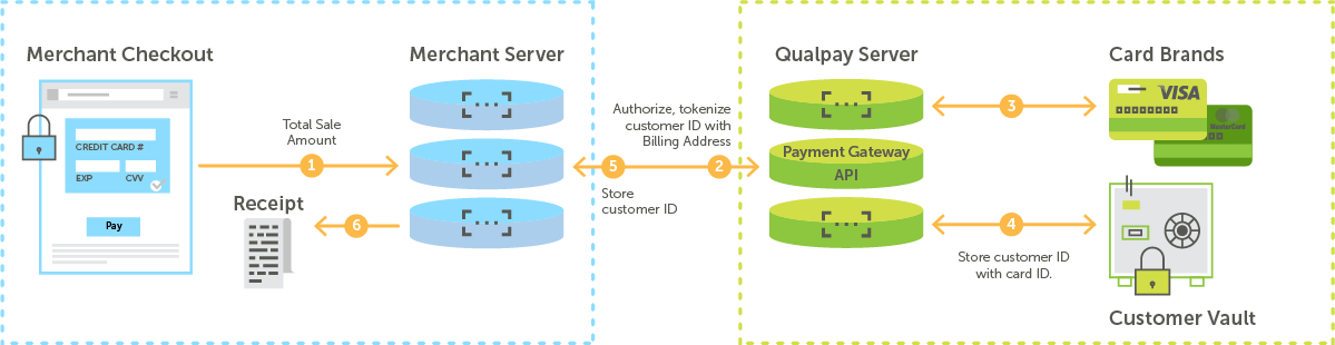 - The merchant server sends the following to the Qualpay server: the payment information and either a request for authorization or a request to perform a sale and tokenize.